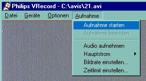 | Es ist soweit. Wir machen unsere erste Probeaufnahme: Einfach im Menü Aufnahme den Punkt Aufnahme starten wählen und dann mit OK bestätigen. Die Aufnahme startet und kann mit ESC abgebrochen werden. Wenn man mehrere Aufnahmen machen will darf man nicht vergessen einen neuen Namen zu verteilen. Der Computer fragt nicht nach und überschreibt gnadenlos das vorherige File! |
