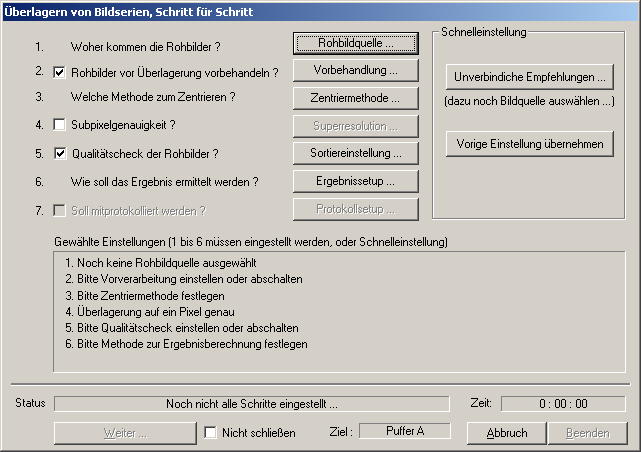 Nun muß noch die Aufnahmezeit eingestellt werden und das passiert hier:![]() ![]() 60 - 120 Sekunden bei 5 Bildern pro Sekunde das kommt man auf 300-600 Bilder. Das reicht für die meisten Fälle. |