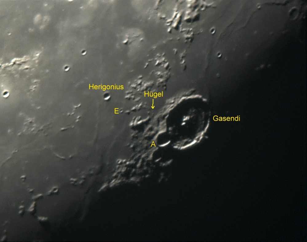 Hauptkrater Gasendi Durchmesser 110km Nebenkrater Gasendi A: 33km Der Zentralberg in der Mitte hat 2 Gipfel und erhebt sich nur 1200m über den Kraterboden Die kleineren Hügel im Hauptkrater sind nur wenige 100 Meter hoch und nur durch den schrägen Lichteinfall noch sichtbar. Krater HERIGONIUS: 15km Nebenkrater HERIGONIUS E: 7km Die kleinste noch einwandfrei wahrnehmbare Struktur ist ein kleiner Hügel zwischen HERIGONIUS und Gasendi Breite : 2,5km Höhe ca 400m |