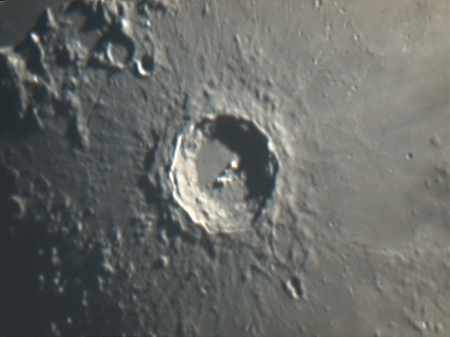| Krater Kopernicus Durchmesser ca. 93km Kraterwandhöhe 3600m Höhe der Zentralberge 1200m Aufgenommen mit dem 200mm F6 GSO Spiegelteleskop auf einer HEQ5. Es war stark windig und kalt (-5Grad und feucht). Das Seeing war geprägt von starkem Wabern und nur sehr wenigen ruhigen Augenblicken 1200 Bilder mit 5% Verwendung in Giotto gemittelt dann den Blaukanal neu berechnet und leicht nachgeschäft. |