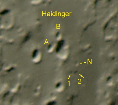 Krater Haidinger: Der Krater Haidinger sieht aus wie ein Mickey Maus Kopf, ist aber ein interessantes Objekt Insbesondere die kleineren Krater ausserhalb des Hauptkraters sind bei flachem Licheinfall gut zu sehen. Haidinger: Durchmesser 21km Haidinger A: Durchmesser 9km Haidinger B: Durchmesser 10km Haidinger N: Durchmesser 6km 1: Durchmesser 3km 2: Durchmesser 5km Noch kleinere Strukturen zu fotografieren wird mit meinem Fernrohr sehr schwer werden, da dafür bei dieser Größe eine perfekte Optik Vorraussetzung wäre und die ist es ganz bestimmt nicht. Trotzdem bin ich sehr zufrieden. |